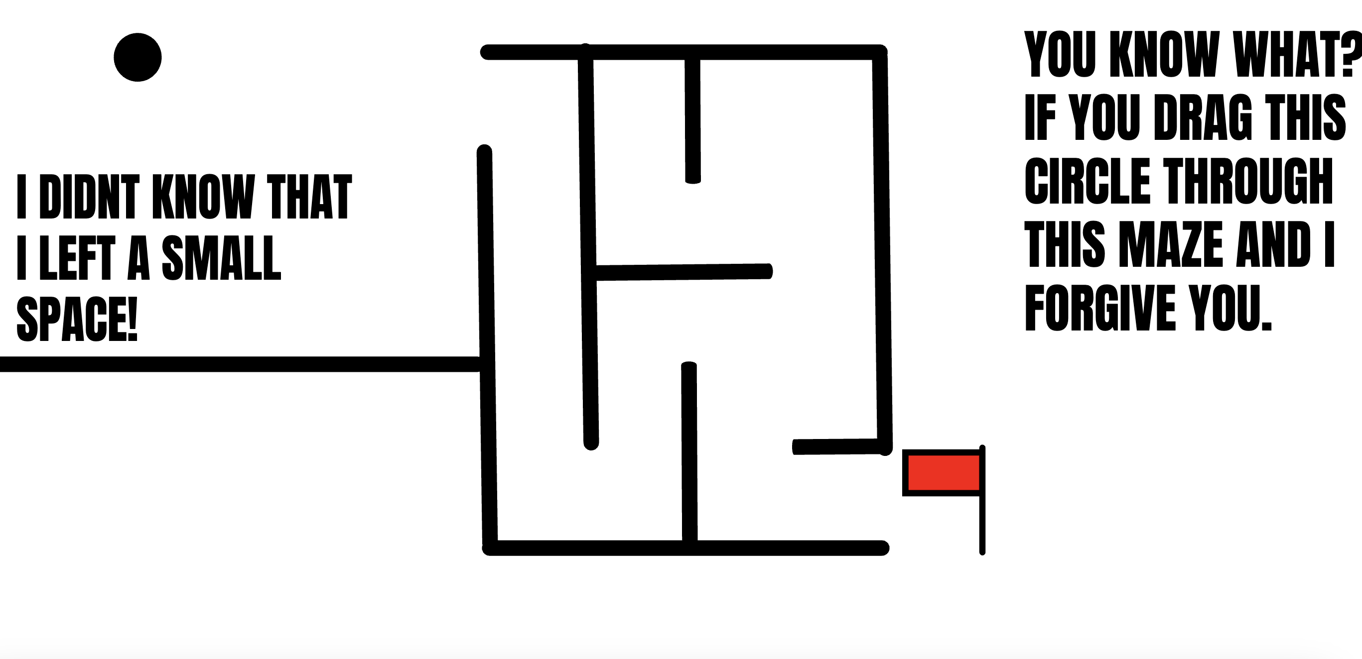 by the way, for the maze section im assuming the code is something along the lines of "if mouse down and touching mouse, then go to mouse position" which is cool but if you do that, it will stop following the mouse if you move it too far away. a better way to do this would be to wait until the circle is clicked on, and then keep moving the circle to the mouse regardless of if its actually touching the mouse or not, until the mouse is no longer down